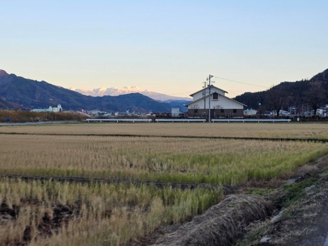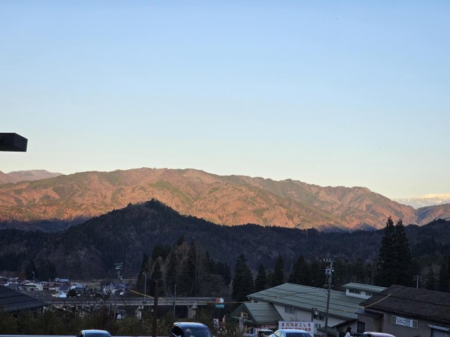 ぬく森の湯すぱーふるから出るとすぐに夕日に照らされた山々を見ることができます。帰りは来た道を1時間ほどかけて戻ることになりますが、県道471号を通ると視界いっぱいに秋の色に染まった山々や、天気がいいと少し雪が積もり、夕日にきれいに照らされた乗鞍をみることができます。