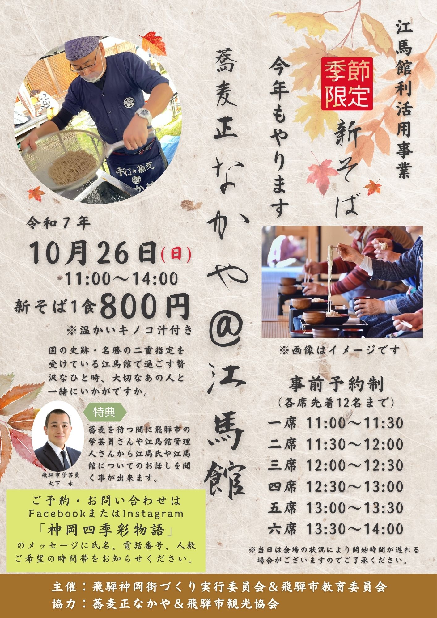 国の史跡・名勝に指定されている江馬館で秋の味覚を楽しんでみませんか。国の史跡・名勝に指定されている江馬館で秋の味覚を楽しんでみませんか。庭園を眺めながら新そばを頂くという贅沢な一時を過ごす事が出来るチャンスです!また、当日は飛騨市学芸員さんや江馬館管理人さんから江馬館の解説もして頂きますので、この機会にぜひ江馬館へお越しください。新そば一食800円 事前予約制一席 11:00〜11:30 12名二席 11:30〜12:00 12名三席 12:00〜12:30 12名四席 12:30〜13:00 12名五席 13:00〜13:30 12名六席 13:30〜14:00 12名ご予約はFacebookまたはInstagram「神岡四季彩物語」メッセージまでご連絡ください。30分毎に12名様までの受付となります。ご予約はメッセージの先着順となりますので、時間帯に関してはご希望に添えない場合がございますのでご了承ください。2025年10月26日(日)