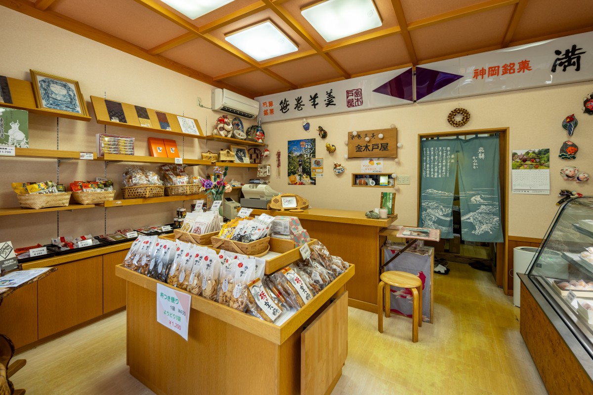 神岡振興事務所駐車場(無料)から歩いて5分ほどの場所にある老舗和菓子屋「金木戸屋(かなきどや)」。