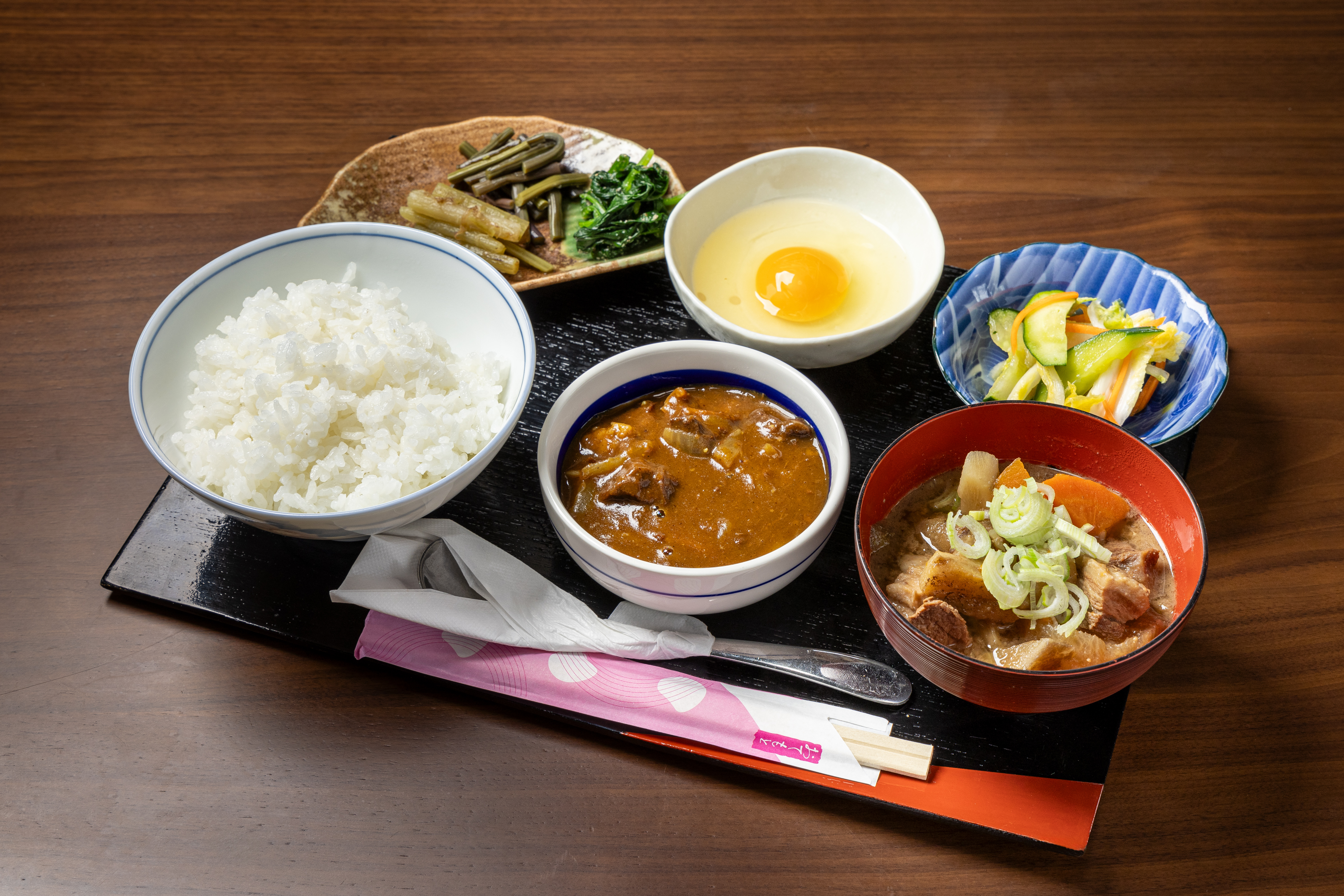 お肉は柔らかく臭みがなく、美味しいと評判です。卵かけご飯セットも好評で、カレーや猪汁、煮物などが全て付いています。焼き立てパンの販売や、テラス席もあったりと、子連れやペット連れの方にもおすすめです。