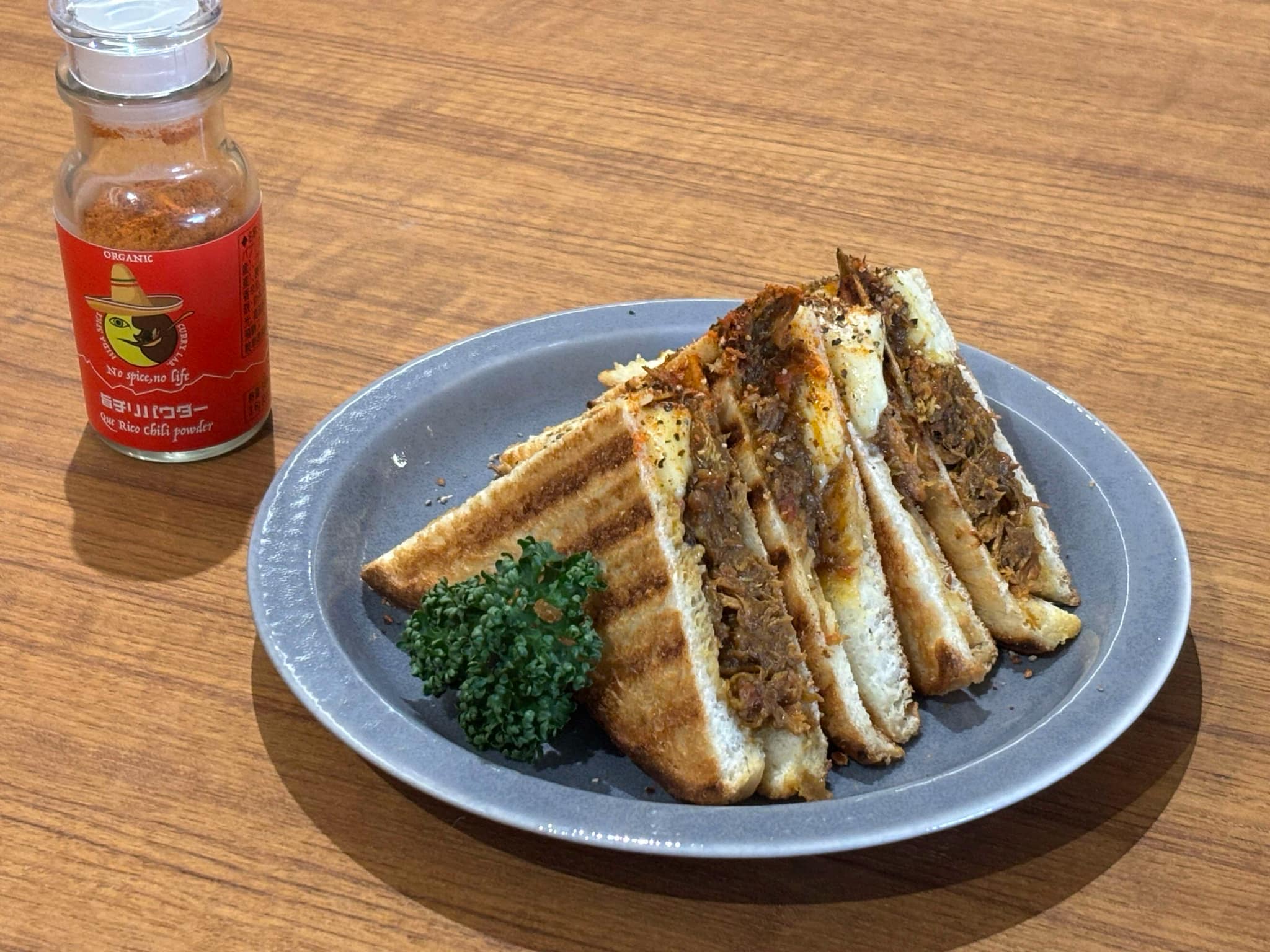 飛騨スパイスカレー研究所の飛騨地鶏の無水チキンカリーをサンドした、スパイスカレーサンドもおすすめです。