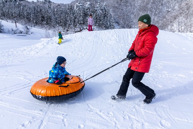 斜度14度~35度、初心者から上級者まで楽しめるので、ご家族で冬の1日を楽しむのにぴったりです。大人用と子ども用のスキーとスノーボードのレンタルはもちろん、スノードライブやそりといった楽しい雪遊びギアのレンタルもあります。