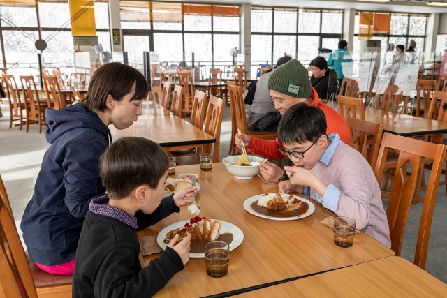 広々としたキッズスペースがあり、小さなお子様連れでも安心です。2階のレストランメニューは全て手作り。スープやチャーシューにこだわった「かわいラーメン」や、人気のカツカレーなど、「ゲレ食なのに美味しい!」と評判です。